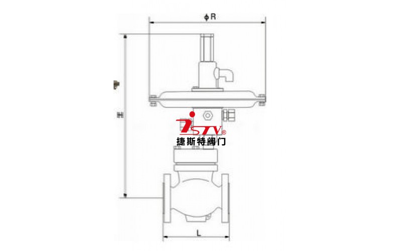 該閥采用大膜片執(zhí)行機(jī)構(gòu)輸出力大穩(wěn)定,對(duì)壓力流量微小變化極其敏感,控制精度很高,閥芯采用單座流開(kāi)(高進(jìn)低出)設(shè)計(jì),在閥蓋處(和閥體連接處)安裝有平衡膜片(起到閥前壓力平衡,消除不平衡力)閥后壓力經(jīng)取壓管進(jìn)入薄膜執(zhí)行機(jī)構(gòu),同薄膜執(zhí)行機(jī)構(gòu)調(diào)節(jié)彈簧相比較,壓力達(dá)不到設(shè)定值(調(diào)節(jié)壓縮執(zhí)行機(jī)構(gòu)彈簧)閥后壓力則變大,反之則變小。